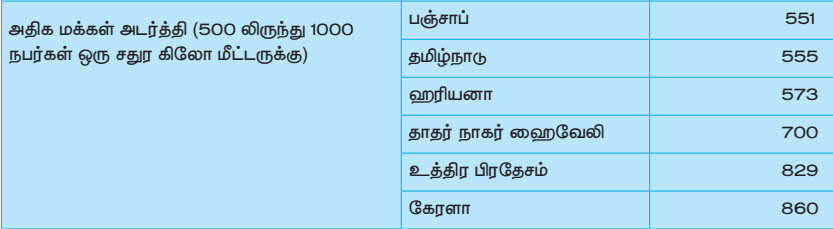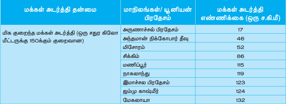 விளக்கம்: உலகின் மக்களடர்த்தி மிகுந்த பத்து நாடுகளில் இந்தியாவும் ஒன்று. இந்தியாவில் மிக அதிக மக்கள்டர்த்தியைக் கொண்ட மாநிலமாக பீகாரும் (1106 பேர்/ச.கி.மீ) மிக குறைந்த மக்கள் அடர்த்தியைக் கொண்ட மாநிலமாக அருணாச்சலப் பிரதேசமும் (17 பேர்/ச. கி.மீ) உள்ளது.