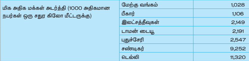 விளக்கம்: யூனியன் பிரதேசங்களில் புதுடெல்லி (11320 பேர்/ச.கி.மீ) அதிக மக்களடர்த்தியைக் கொண்டதாகவும், அந்தமான் நிக்கோபார் தீவுகள் குறைந்த மக்களடர்த்தியைக் கொண்டதாகவும் (46 பேர் ச.கி.மீ) உள்ளன.