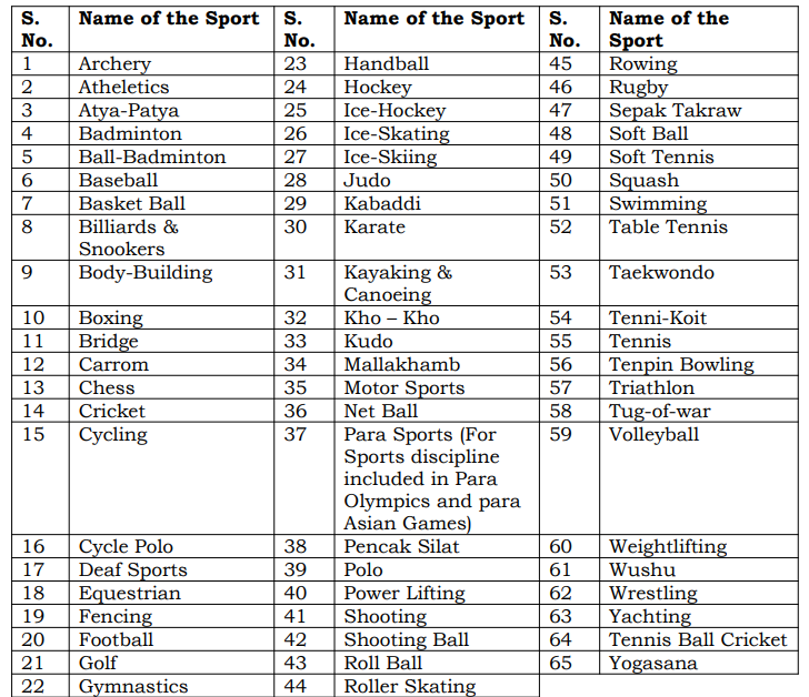 List of Sports which qualify for Appointment of Meritorious Sports persons: