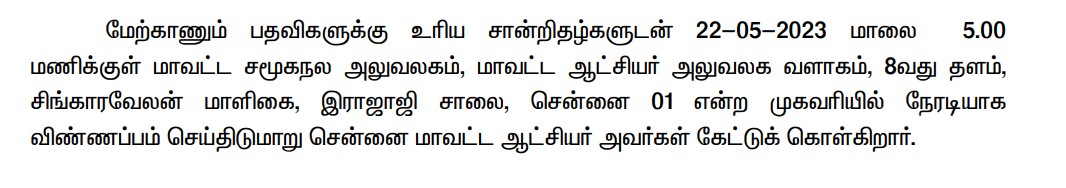 How to Apply: Interested and eligible candidates can download the application form from the official website of Chennai OSC Centre @ www.chennai.nic.in. The filled-in application form should be sent along with the necessary enclosures to the following address. The last date for the receipt of the application form along with the enclosures is 22.05.2023 @ 05.00 PM.