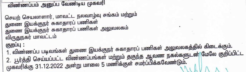 Last Date to Apply For DHS Virudhunagar Recruitment : 31-12-2022, 5:00 PM