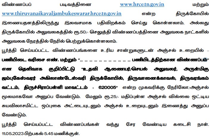The recruitment notification has been uploaded on the official website of Jambukeswarar Temple @ www.thiruvanaikavaljambukeswarar.hrce.tn.gov.in. Candidates are advised to read the notification carefully before filling the application form. The last date for the receipt of application along with enclosures is 11.05.2023 @ 05.00 PM.