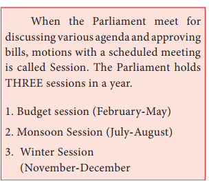 When the Parliament meet for discussing various agenda and approving bills, motions with a scheduled meeting is called Session. The Parliament holds THREE sessions in a year.