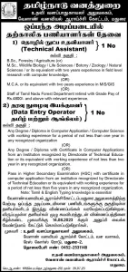 Technical Assistant – B.Sc. Forestry / Agriculture OR M.Sc. Wildlife Biology / Life Sciences / Botany / Zoology / Natural Sciences / or its equivalent with two years’ experience in field level research with Computer knowledge. OR M.C.A. or its equivalent with tow years’ experience in MIS/GIS. OR Staff of Tamil Nadu Forest Department retired with Grade Pay or Rs.4800/- and above with relevant experience.