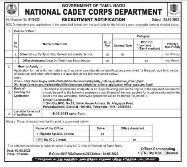 NCC Chennai Recruitment 2023 Office Assistant Posts: NCC Chennai Recruitment 2023 has announced job vacancies for the posts of Driver and Office Assistant. Interested and eligible candidates can download the application form from the official website www.tn.gov.in and submit their application along with required documents before the last date of 16.06.2023.