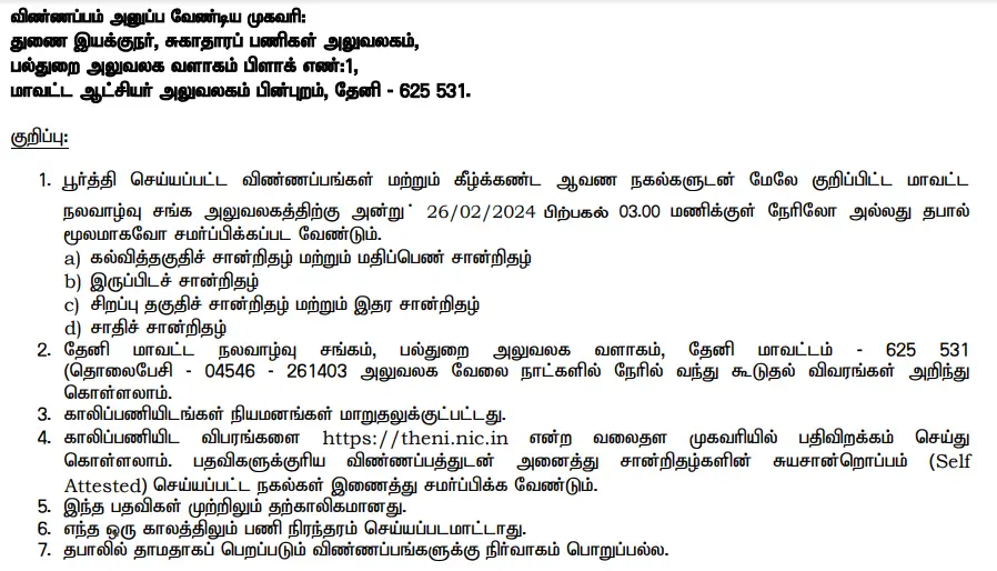 How to Apply: Interested and eligible candidates are required to download the application form from the official website of Theni DHS at www.theni.nic.in. The application form, along with all necessary enclosures, must be submitted before the deadline. Candidates should ensure that they fill out the application form accurately and attach all required documents.