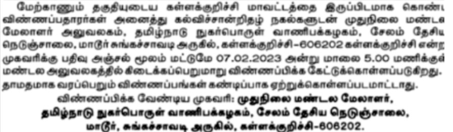 Interested and eligible candidates can apply offline through the prescribed application format. The Applicant needs to send the application form along with relevant self-attested documents to the Regional Manager, Tamil Nadu Civil Supplies Corporation, Salem National Highway, Kallakurichi-606202 on or before 07-Feb-2023.