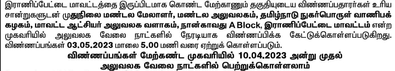 Selection Process: The selection process for the TNCSC Ranipet Recruitment 2023 includes shortlisting and followed by an interview. The final selection will be made based on the performance of the candidates in both the written test and interview.