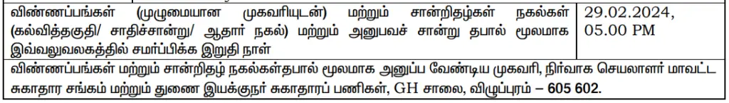 Eligibility Criteria: Candidates applying for the Viluppuram DHS Recruitment 2024 must meet specific eligibility criteria for each position. Educational qualifications, age limits, and other criteria are detailed in the official notification, which can be found on the official website. Applicants are advised to carefully review the eligibility requirements before submitting their applications.